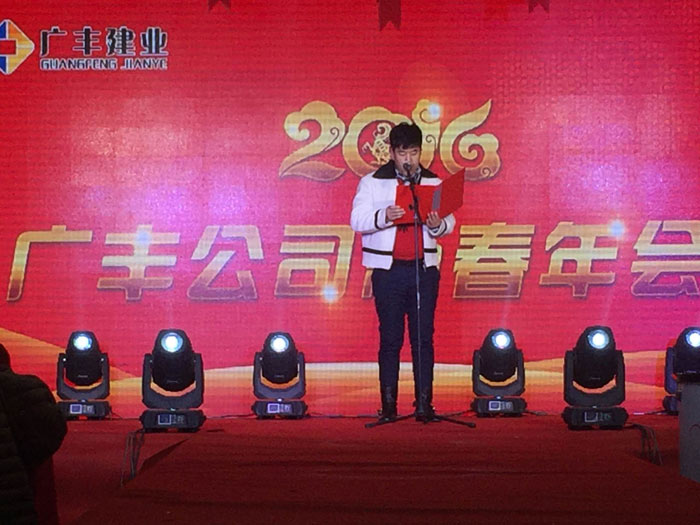 下午4點(diǎn)半,伴隨著新年的祝福聲、歡呼聲和主持人熱情洋溢的祝福聲,廣豐集團(tuán)2016新春年會(huì)正式開始,集團(tuán)公司董事長(zhǎng)王曉軍先生首先致辭,向公司全體員工致以新春的問候和美好的祝福。