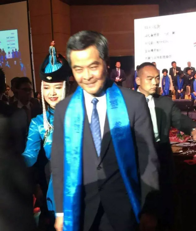 (前排左四為內(nèi)蒙古自治區(qū)主席布小林、左五為香港特首梁振英、左六為香港內(nèi)蒙古工商聯(lián)合總會(huì)會(huì)長(zhǎng)陳建文)